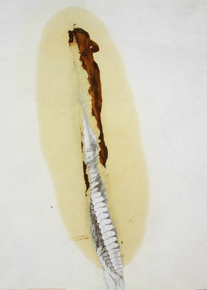 As I work in my studio things get cleared aside, dropped, piled up, lost and forgotten - spillages, stains, accidents occur – byproducts of purposeful action; the mess left during the process of creating something of greater significance; There are, however, definite possibilities inherent in these abject remains. Out of the corner of my eye I notice an interesting juxtaposition of line, stain and torn part-image, and once these are conjoined there is a suggestion of something other. Something more? Edges become points of departure, the place where action happens, boundaries are blurred and borders crossed between glued down fragments of mass produced imagery and the application of a fluid mass of ink and water or a containing pencil line. I cut, tear, mark, layer and stroke the surface; shapes are formed from disparate elements, associations conjured, movement evoked, magic made. Each assemblage of marks and materials is an almost unconscious process - repairing, augmenting and reworking the fragments, creating new spaces, A solitary game of Exquisite Corpse.