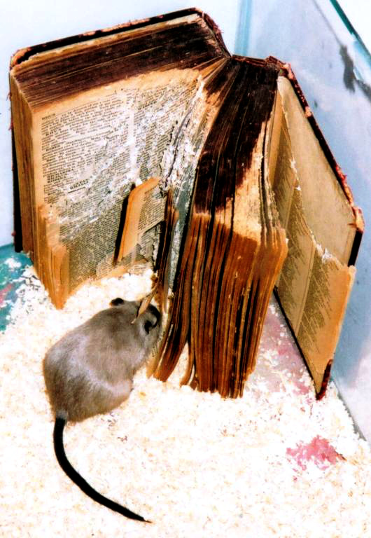 Who thinks postmodern art is so much smug pretentious vacuous wank? Not always. Here, a pet gerbil enthusiastically munched its way through The New Illustrated Universal Reference Book - recycling via its physical labour the arrogant presumption that collections of information can encompass history and teach anything worth knowing. Who controls what goes in; what’s left out; how it’s presented and used? This rodent representative of the teeming masses followed its own universal agenda to keep warm, comfortable and secure - with no respect for the supposed wisdom and disciplining power dispensed by elites (1).