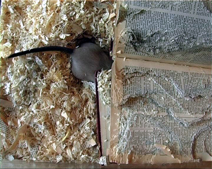 Within theconfines of its restricted living space, this small rodent goes about the business of ‘mining’ the data for its own purposes. Over a period of several weeks the gerbil has ‘edited’ the book, translating the carefully constructed text into an unruly mass of dislocated fragments, recycling it as material for building a warm and secure nest. The fate of the book dissolves the architecture of knowledge into that of action. Likewise, the physical object diminishes in size as its shape mutates and disintegrates, and its architecture is demolished. Yet the gerbil as architect works to reconstruct its environment according to its own design.