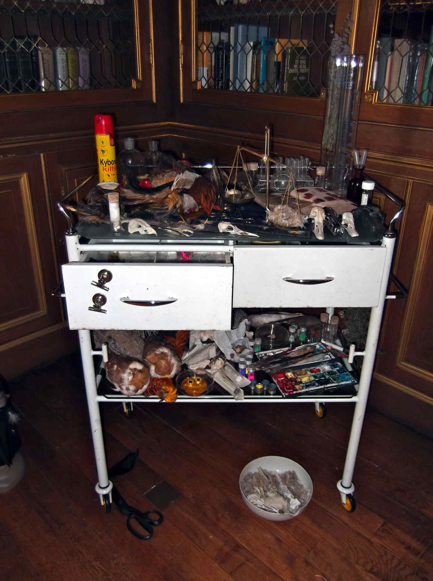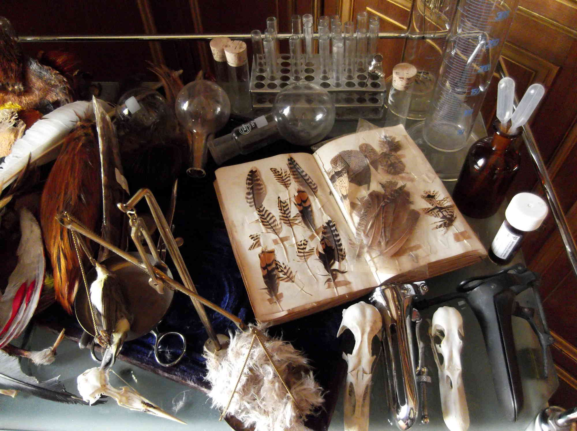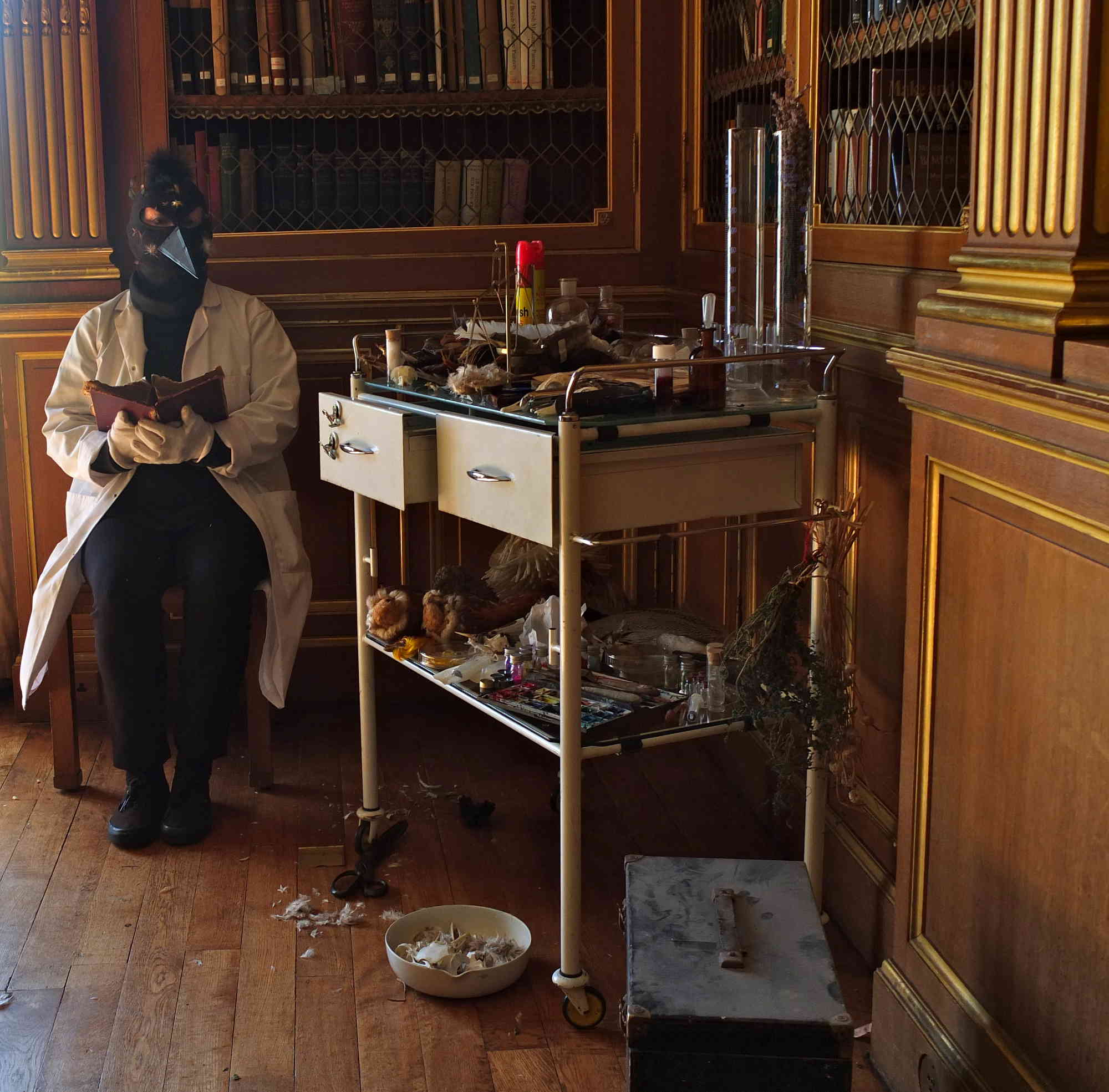 This work is inspired by the artist and close friend of Leonora Carrington, Remedios Varo and her painting Creation of the Birds. Whereas Varo's delicate owl woman pumps primary coloured pigments through her Bosch-like apparatus, paints with a brush string of her heart-violin, and refracts star/moonlight through her Newtonian magnifier, setting her birds free from their two dimensionality, these birds lie on an old medical trolley alongside assorted paraphernalia - real creatures of death and demolition, part objects awaiting reconstruction and freedom through the viewer's imaginative conjecture.