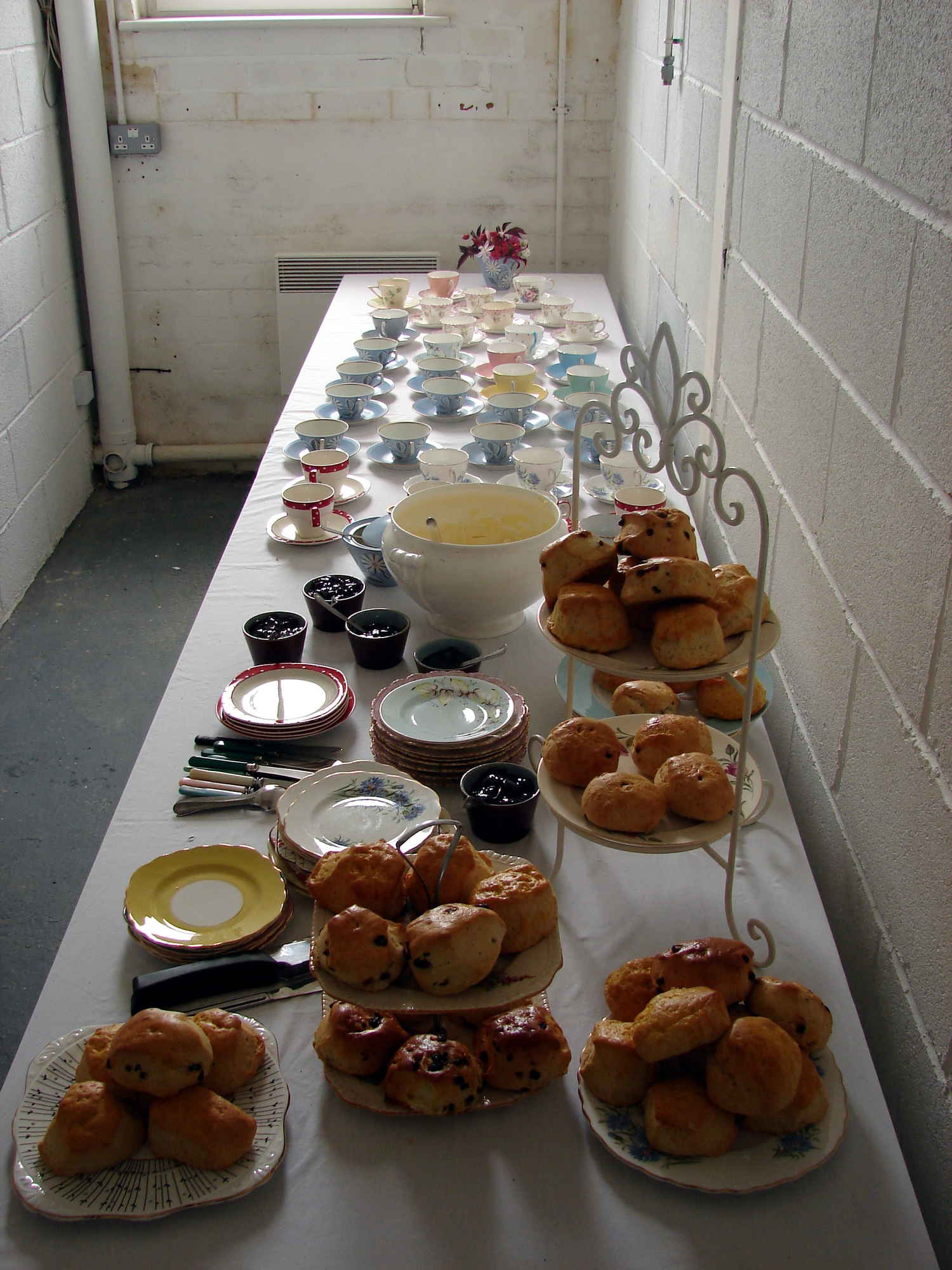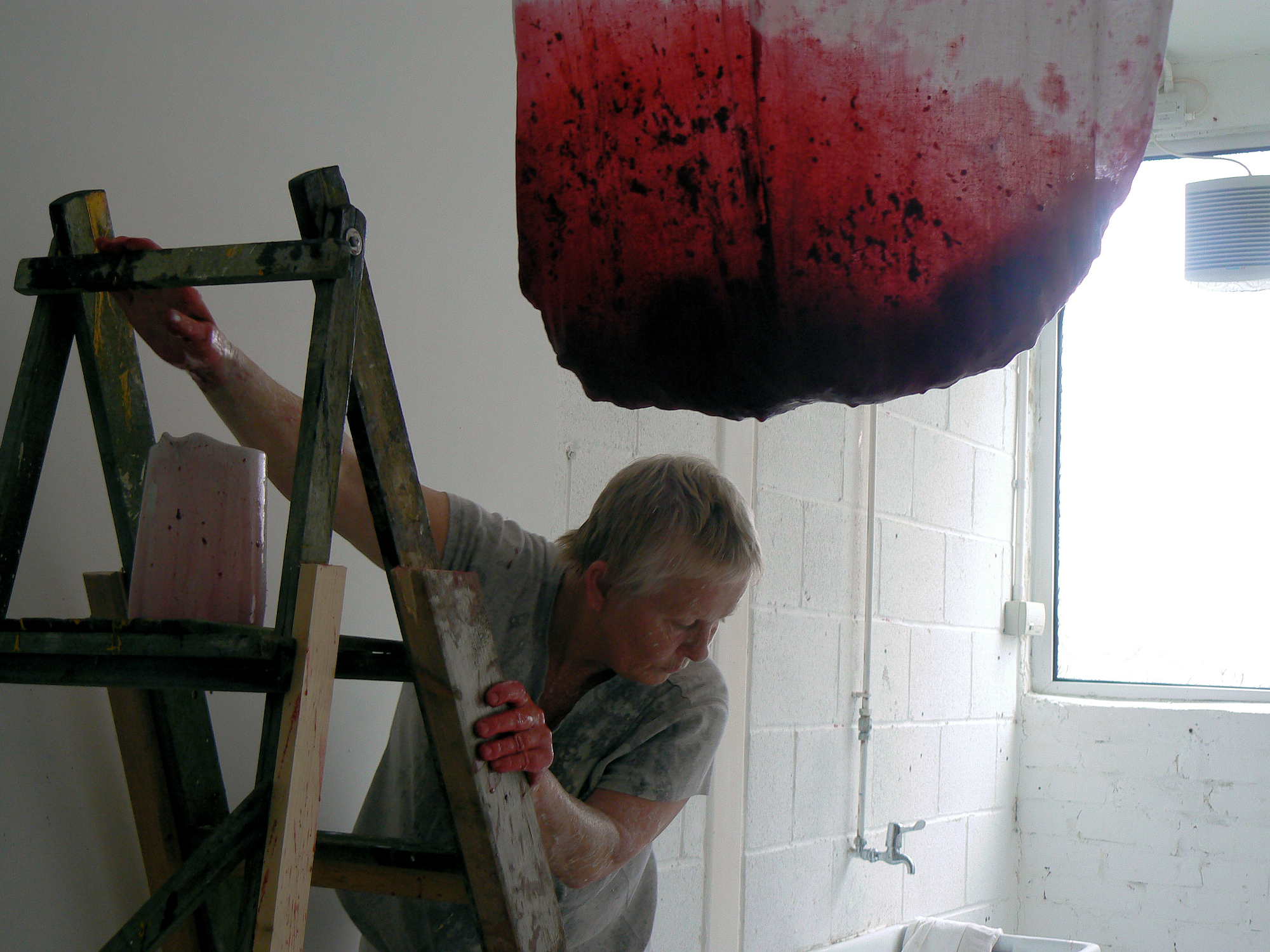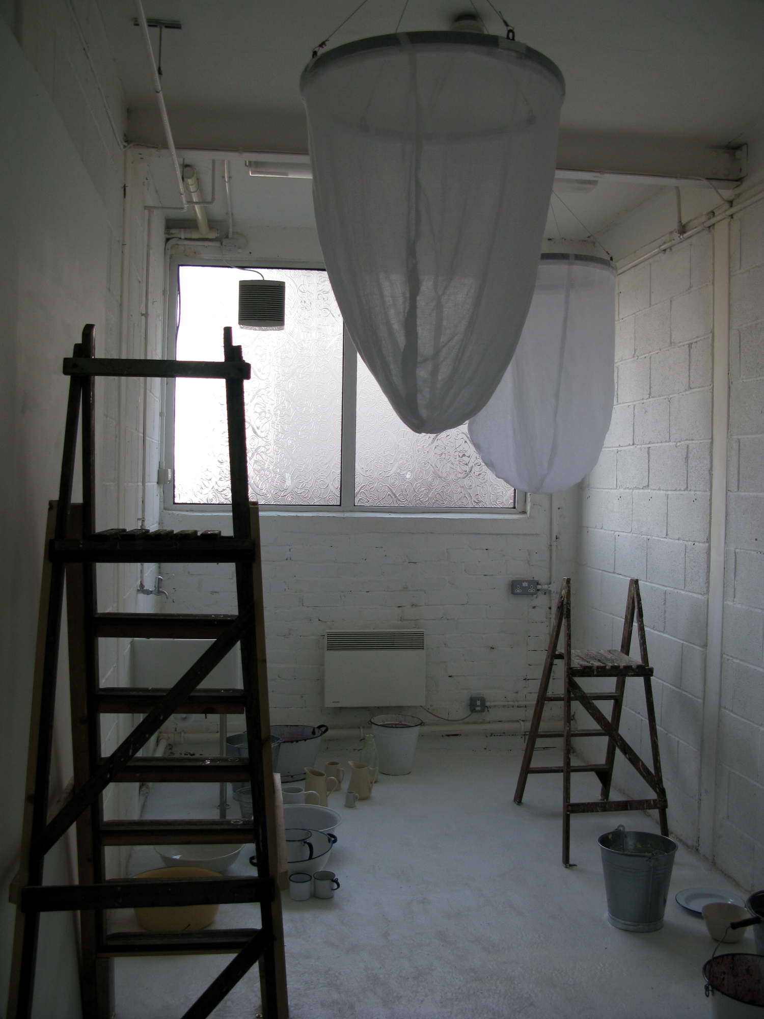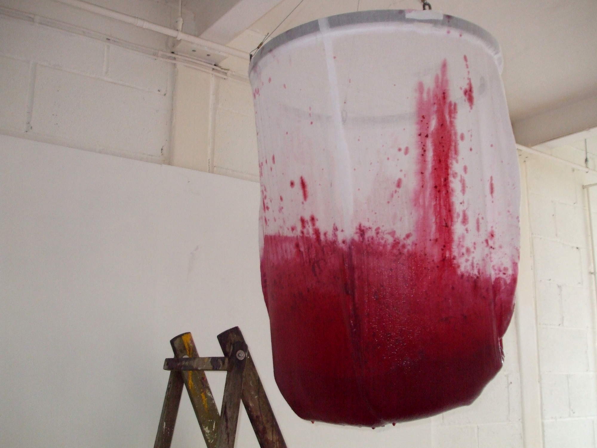 For over an hour in the Saltburn Gallery, Cleveland, two women methodically undertake what appear to be food-processing operations, struggling up stepladders, pouring red fruit-mash and cream into gigantic hanging muslin bags, kneading and squeezing the strained residues into jugs and buckets. This onerous task yields increasing quantities of liquids then refiltered through the system and, as time passes, the products accidentally splatter across the floor and walls and the artists themselves who become more and more bedraggled - occasionally even rinsing their heads and mouths with the juices - until the entire scene suggests a horror movie shoot. When their discomfort at the smell and feel of the sticky substances mingling and stinging eyes, filling hair and covering bodies becomes too much, the visibly tiring women abandon their travails - leaving a random mosaic of bright purples, reds and pinks among discarded containers in the once-clean white space. Nevertheless they soon reappear with only the worst of the mess washed off, in an adjacent room holding tables set with massed ranks of delicate china. Preparing cuppas and scones with blackberry and apple jam and cream, they serve the audience afternoon tea.