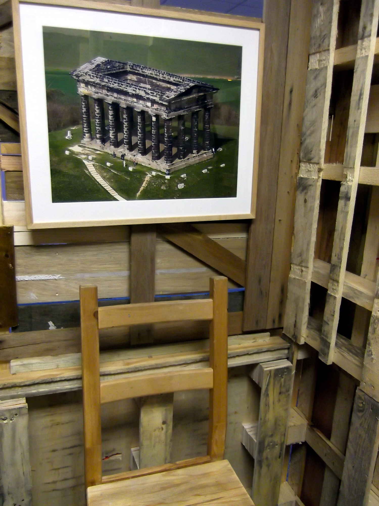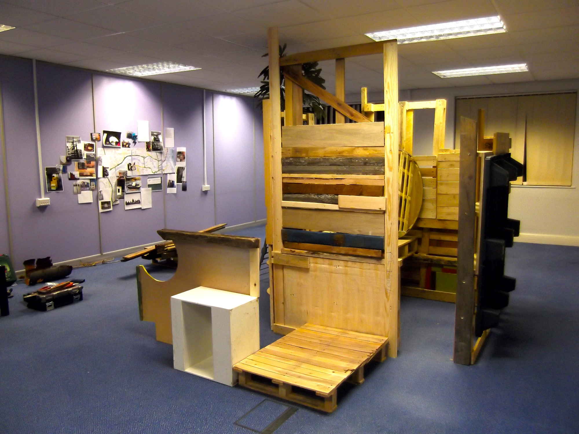 An installation constructed over a period of several weeks in a partially empty office block located in an industrial estate in north Sunderland. The work was created on site with discarded materials from the surrounding vicinity. In one sense an architectural construction - a temporary dwelling space within a bleak empty office space with connotations of squatting - the type of ad hoc construction found in marginal urban spaces to accommodate the disenfranchised. In another sense an installation referencing the formal elements of sculpture and on view as an art work. And further, an exploration, a performative piece where the work starts and continues with the process of selection, collection, placement, arrangement, use and dialogue.