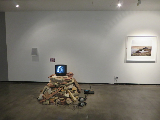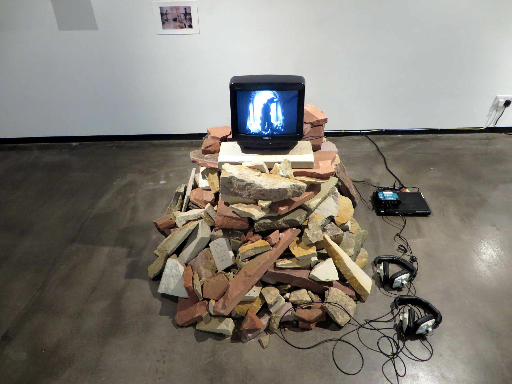 A bulky small-screen video monitor sits on what looks like a pile of rubble or perhaps a waymarker cairn made of broken and partly dressed masonry. These remnants and rejects were sourced from the Hutton Stone Company Ltd – also based at the disused Winfield airstrip, near Berwick upon Tweed – where material from quarries across the region and further afield is processed for use in construction, including for the restoration and repair of historic buildings and sites, and doubtless also new developments simulating traditional architectural vernaculars. The monitor, meanwhile, hosts a short film of a man in a bear suit wandering around the derelict airfield buildings. Carefully composed, lingering shots show the ruins and the pantomime bear peering into doorways and out of windows, stamping on rubbish, and banging metal on wood – engaged in apparently aimless, rather melancholy play or perhaps some kind of hopeless quest, and hinting at a story which is not quite evident other than as an uncanny juxtaposition of incongruous elements.