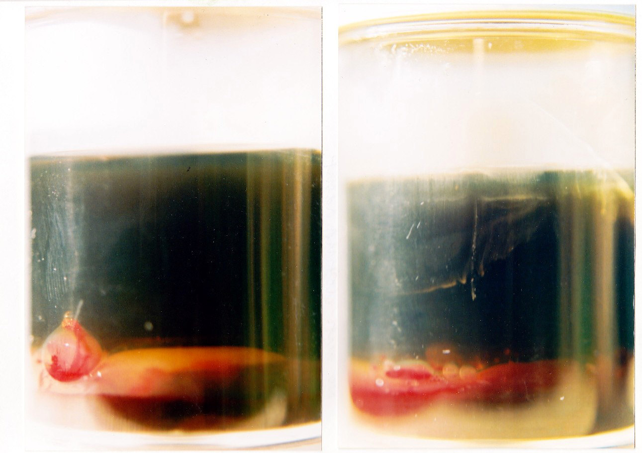 In practice, the blood and oil resisted being mixed; they could be juxtaposed, but remained separate. Just as seawater is hidden from the sun underneath oil slicks, this mammalian blood (a phylogenetic analogue of seawater) was sealed in from the atmosphere by exhaust oil rendered thicker and darker with immersed particles picked up from the internal surface of the ailing engine. The blood was itself heavy with waste products and exhausted of oxygen and nutrients after its passage around the tired body's machine. Over its lifetime as an exhibit, the components sedimented into plasma and corpuscles; and the engine oil's components might do something comparable given geological time.