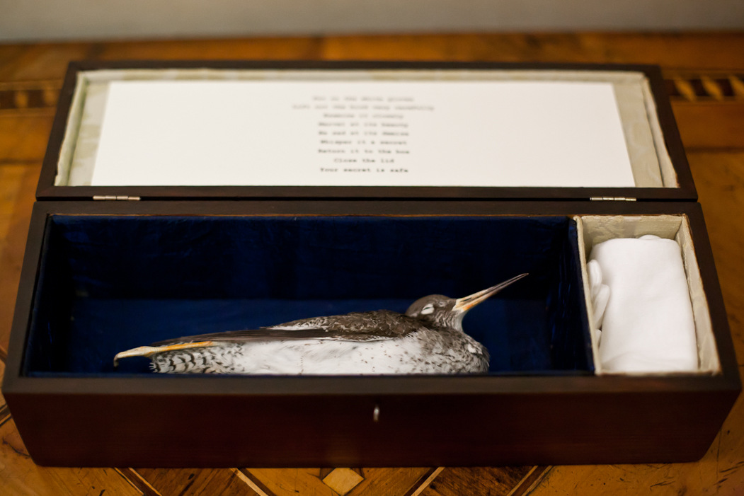 The work engages with the context of the Freud Museum as a site of display as well as referencing psychoanalytic notions of free association and confidential disclosure. First staged during The Dream of Fluxus as part of Three Star A La Carte at the Baltic Centre for Contemporary Art, Gateshead, the bird* is transformed in this travelling performance by the weight of its secrets while the attendant remains vigilant.