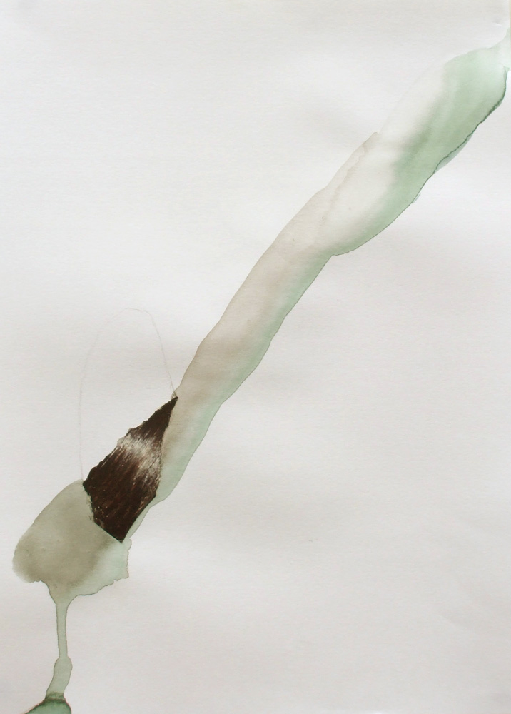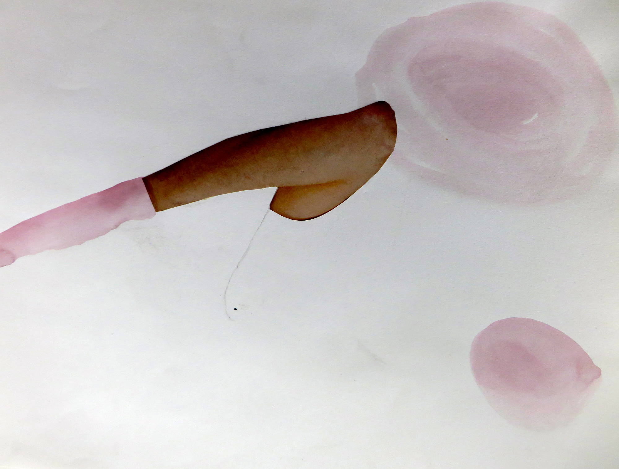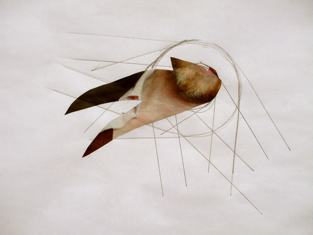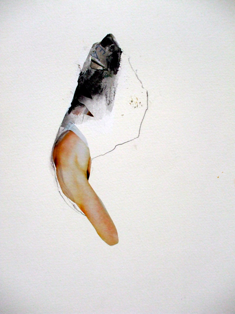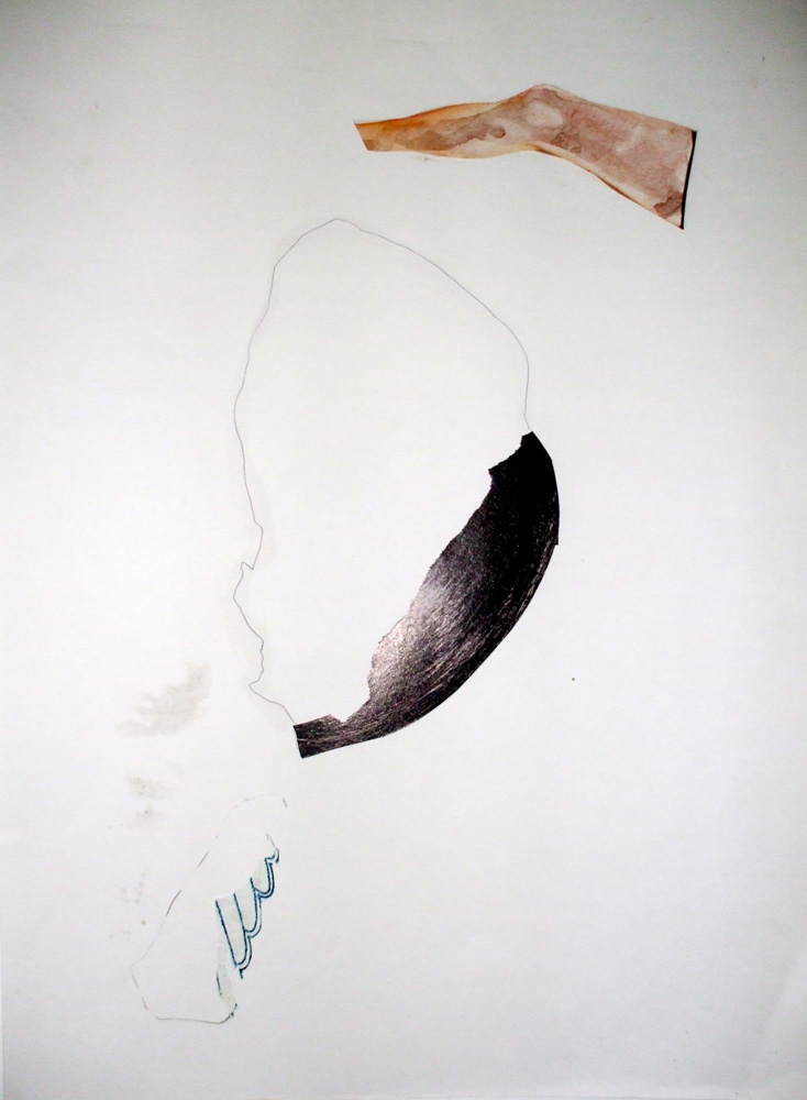 As I work in my studio things get cleared aside, dropped, piled up, lost and forgotten - spillages, stains, accidents occur – byproducts of purposeful action; the mess left during the process of creating something of greater significance; There are, however, definite possibilities inherent in these abject remains. Out of the corner of my eye I notice an interesting juxtaposition of line, stain and torn part-image, and once these are conjoined there is a suggestion of something other. Something more? Edges become points of departure, the place where action happens, boundaries are blurred and borders crossed between glued down fragments of mass produced imagery and the application of a fluid mass of ink and water or a containing pencil line. I cut, tear, mark, layer and stroke the surface; shapes are formed from disparate elements, associations conjured, movement evoked, magic made. Each assemblage of marks and materials is an almost unconscious process - repairing, augmenting and reworking the fragments, creating new spaces, A solitary game of Exquisite Corpse.
