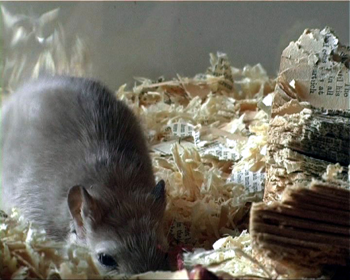 Within theconfines of its restricted living space, this small rodent goes about the business of ‘mining’ the data for its own purposes. Over a period of several weeks the gerbil has ‘edited’ the book, translating the carefully constructed text into an unruly mass of dislocated fragments, recycling it as material for building a warm and secure nest. The fate of the book dissolves the architecture of knowledge into that of action. Likewise, the physical object diminishes in size as its shape mutates and disintegrates, and its architecture is demolished. Yet the gerbil as architect works to reconstruct its environment according to its own design.