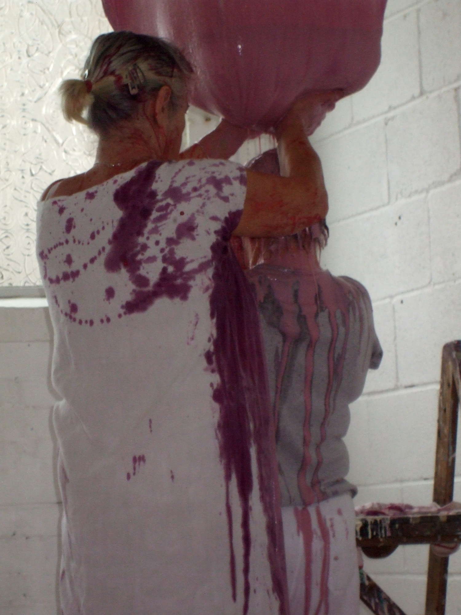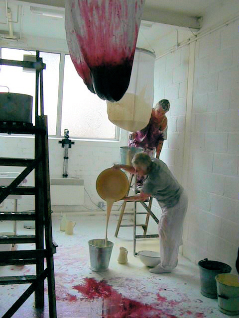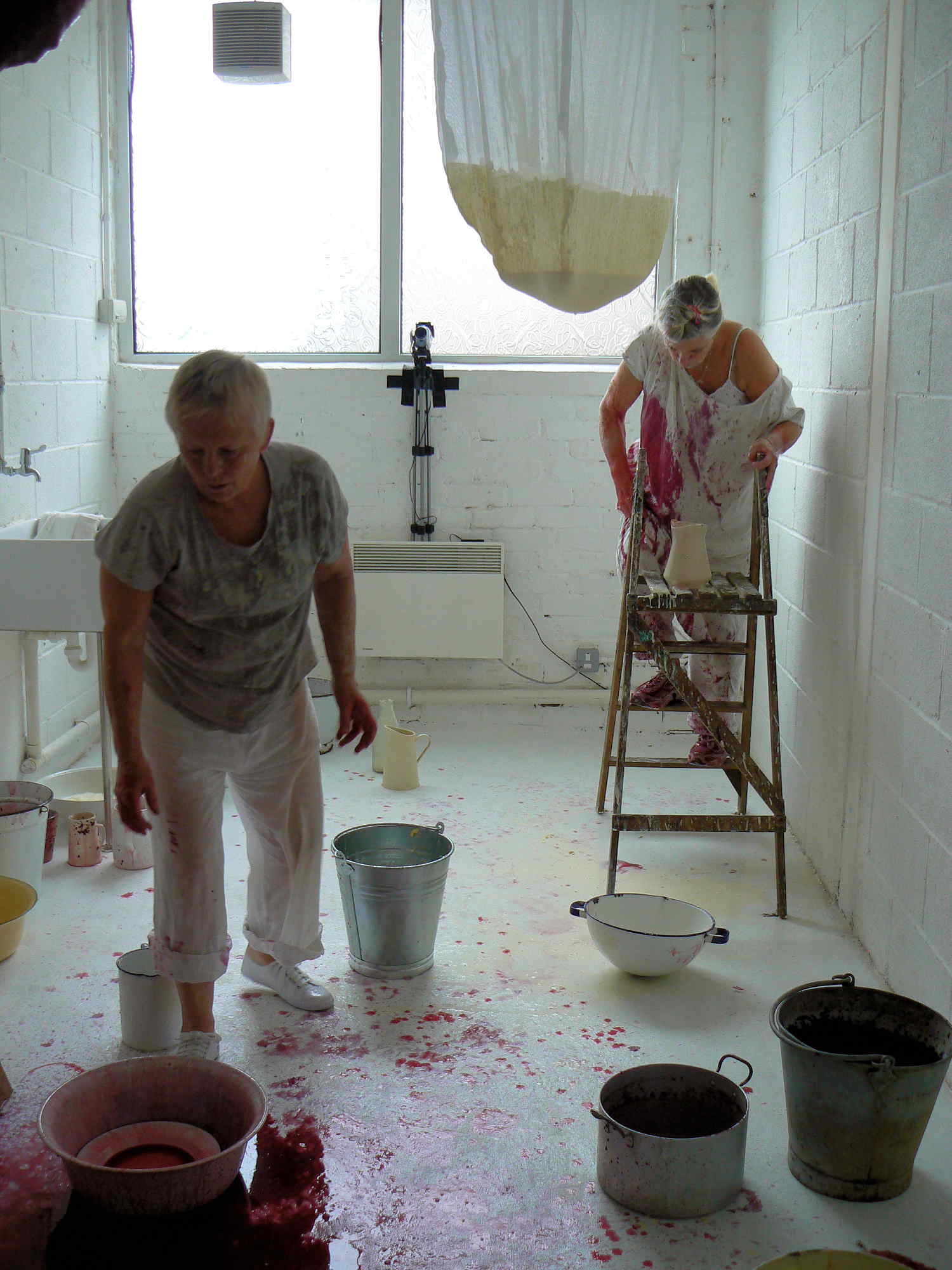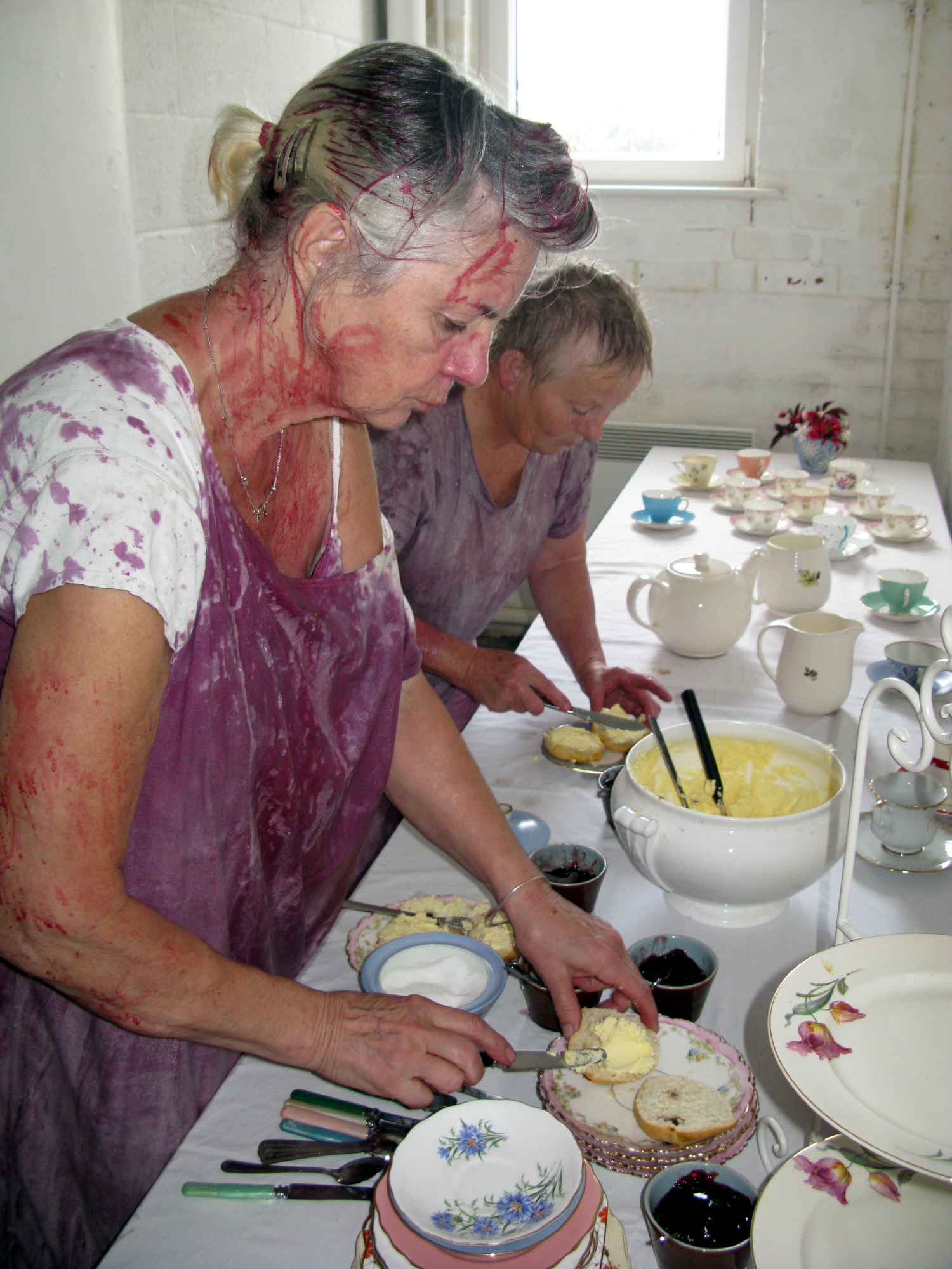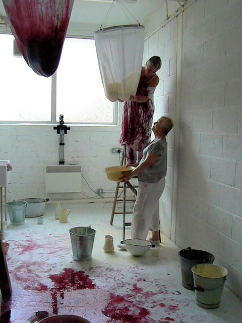For over an hour in the Saltburn Gallery, Cleveland, two women methodically undertake what appear to be food-processing operations, struggling up stepladders, pouring red fruit-mash and cream into gigantic hanging muslin bags, kneading and squeezing the strained residues into jugs and buckets. This onerous task yields increasing quantities of liquids then refiltered through the system and, as time passes, the products accidentally splatter across the floor and walls and the artists themselves who become more and more bedraggled - occasionally even rinsing their heads and mouths with the juices - until the entire scene suggests a horror movie shoot. When their discomfort at the smell and feel of the sticky substances mingling and stinging eyes, filling hair and covering bodies becomes too much, the visibly tiring women abandon their travails - leaving a random mosaic of bright purples, reds and pinks among discarded containers in the once-clean white space. Nevertheless they soon reappear with only the worst of the mess washed off, in an adjacent room holding tables set with massed ranks of delicate china. Preparing cuppas and scones with blackberry and apple jam and cream, they serve the audience afternoon tea.