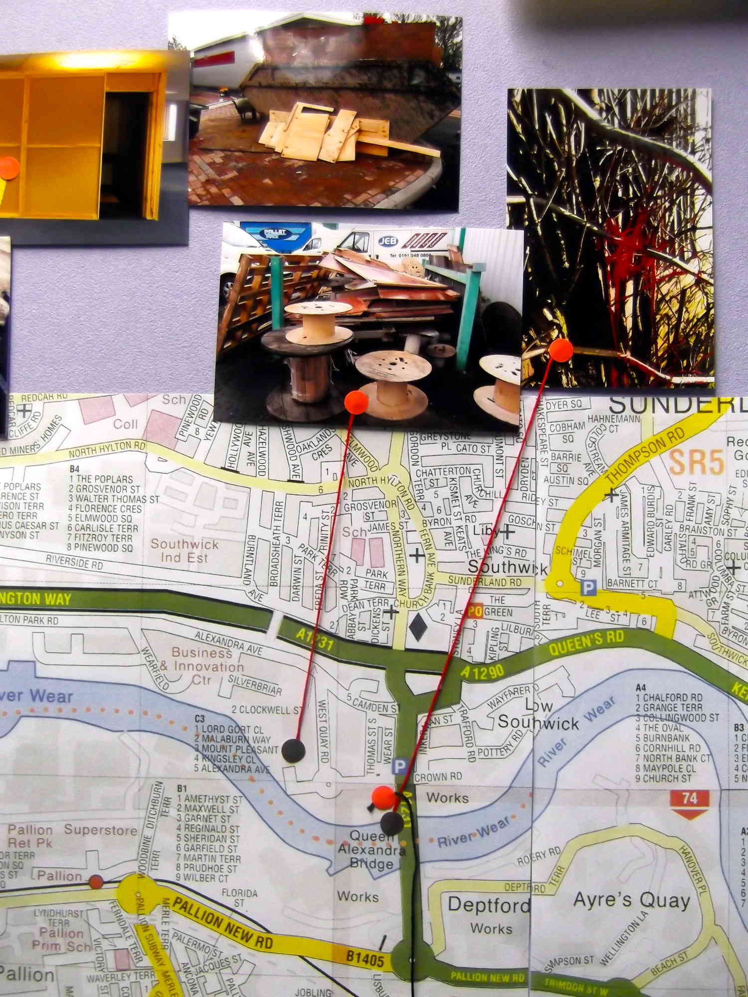 As I 'map' the area - cruise the car parks, look through skips and encounter passers by, I gather lots of anecdotal and photographic research. It has become a fascinating compulsion and the room in which I am building my structure is also filling with, photographs, charts, maps, books, tea, coffee, mugs, kettle, radio...... Its gradually turning into a temporary office cubicle, a studio and research base.