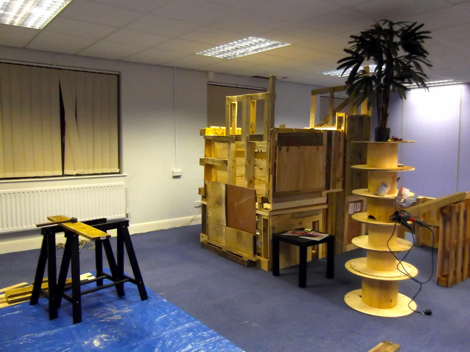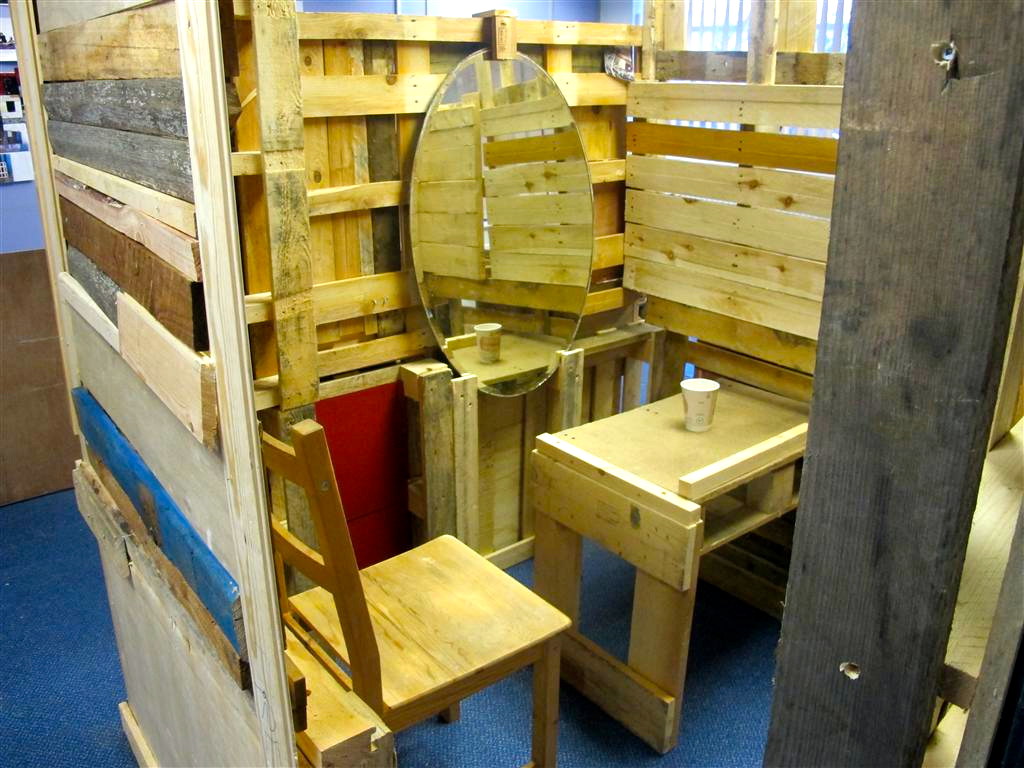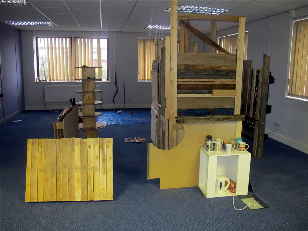 An installation constructed over a period of several weeks in a partially empty office block located in an industrial estate in north Sunderland. The work was created on site with discarded materials from the surrounding vicinity. In one sense an architectural construction - a temporary dwelling space within a bleak empty office space with connotations of squatting - the type of ad hoc construction found in marginal urban spaces to accommodate the disenfranchised. In another sense an installation referencing the formal elements of sculpture and on view as an art work. And further, an exploration, a performative piece where the work starts and continues with the process of selection, collection, placement, arrangement, use and dialogue.